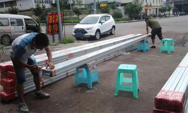 一捆捆打好包的鋁型材整齊的放置在地,等待裝車。  小伙伴們配合默契,齊心協(xié)力搬運(yùn)鋁型材。