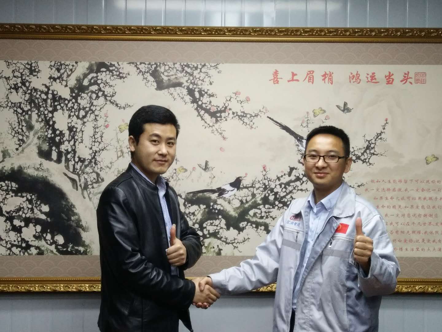 企業(yè)文化大使小敏正在為客人介紹匯利興文化 在此,客服部小敏(企業(yè)文化大使)為來訪的客人們相繼介紹了我司的企業(yè)文化,并帶領(lǐng)客人參觀了匯利興廠容廠貌,詳細(xì)介紹了匯利興的發(fā)展史及企業(yè)文化(三道:人道、孝道、商道,企業(yè)精神:用情做人、用心做事),并帶領(lǐng)客人初步了解了工業(yè)鋁型材、滾筒、精益管、工裝板、精密工業(yè)配件等材料的認(rèn)識(shí),同時(shí)介紹了我司企業(yè)愿景:誓力打造中國自動(dòng)化配件第一品牌,更好的滿足客戶個(gè)性化定制和柔性化生產(chǎn);此后對(duì)于匯利興濃厚的企業(yè)文化及厚重的企業(yè)實(shí)力,一致獲得了客人們高度的贊許及認(rèn)可并表示與匯利興合作十分放心。 客人與匯利興家人合影圖 客人為“喜上眉梢、鴻運(yùn)當(dāng)頭”錦上添花圖景 “相識(shí)滿天下,知心在匯興”,來訪客人受邀相繼在“喜上眉梢 鴻運(yùn)當(dāng)頭”留下深刻的印記,為此錦上添花?!坝36娭?,故源源而來”,相聚匯利興,故交友于匯利興同友人一起共發(fā)展共進(jìn)步。